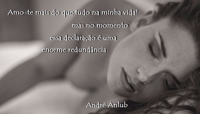André Anlub por Ele mesmo: Eu moro em mim, mas costumo fugir de casa; totalmente anárquico nas minhas lucidezes e pragmático nas loucuras, tento quebrar o gelo e gaseificar o fogo; não me vendo ao Sistema, não aceito ser trem e voo; tenho a parcimônia de quem cultiva passiflora e a doce monotonia de quem transpira melatonina; minha candura cascuda e otimista persistiu e venceu uma possível misantropia metediça e movediça; otimista sem utopia, pessimista sem depressão. Me considero um entusiasta pela vida, um quase “poète maudit” e um quase “bon vivant”.